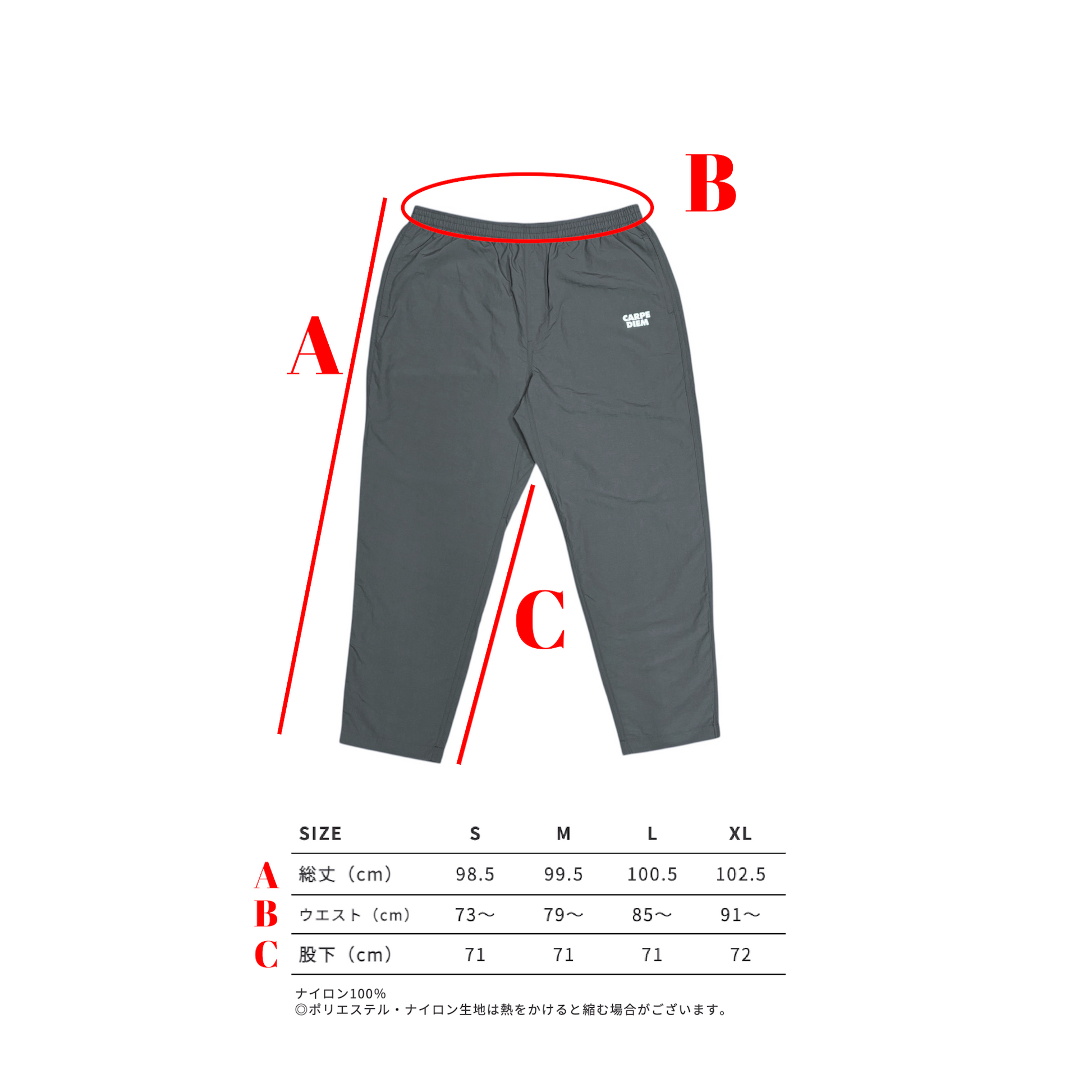 Introducing versatile nylon pants made from lightweight and tough 100% nylon material.